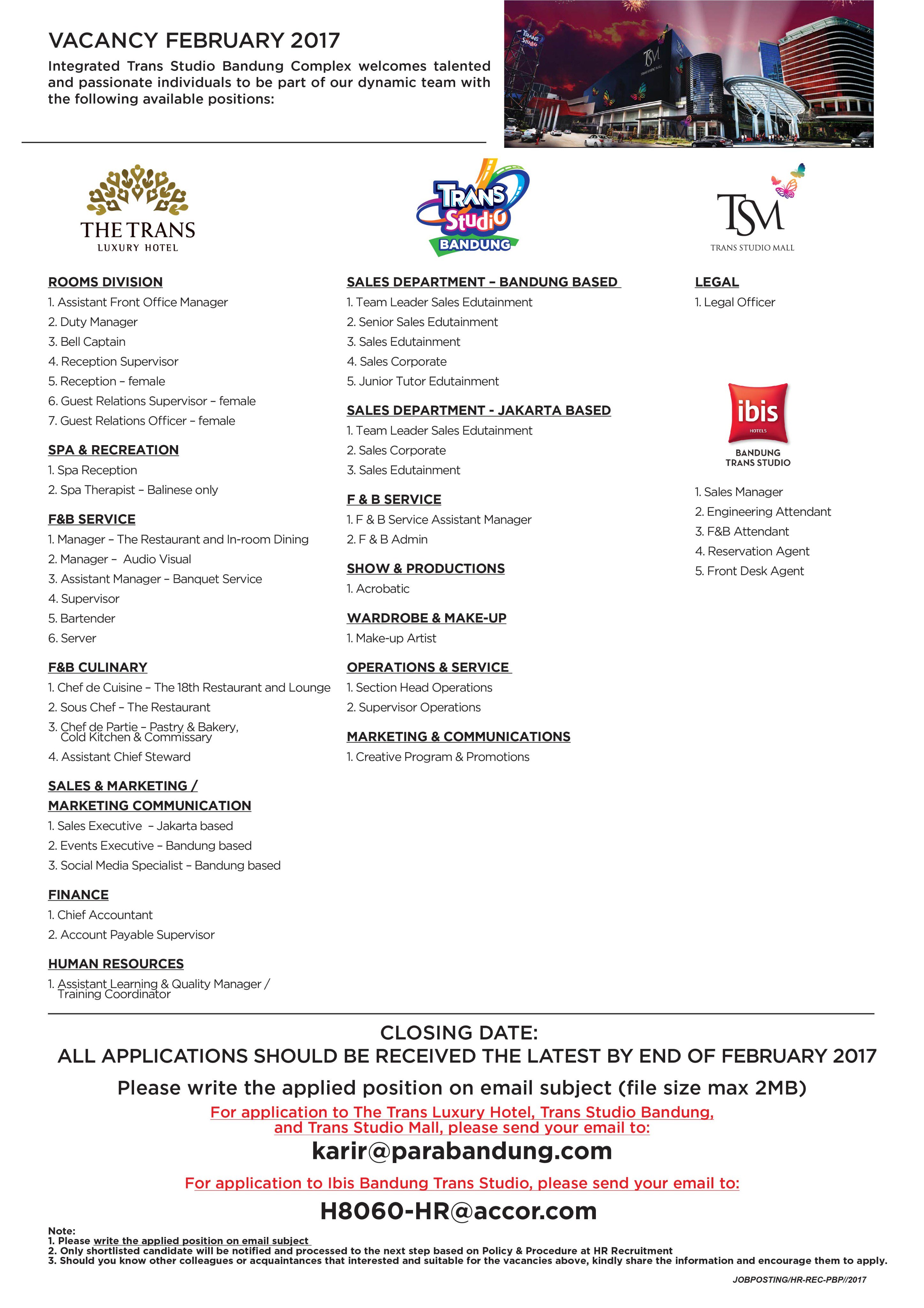 Career Bandung On Twitter Info Loker Trans Studio All Applications Should Be Received The Latest By The End Of February 2017 Loker Lokerbdg Lokerbandung Job Https T Co Qt7ljoagal Twitter